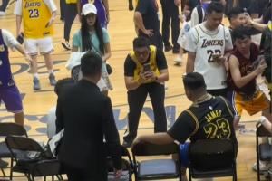 詹姆斯活动结束后 不少球迷围坐在詹姆斯坐过的椅子旁拍照